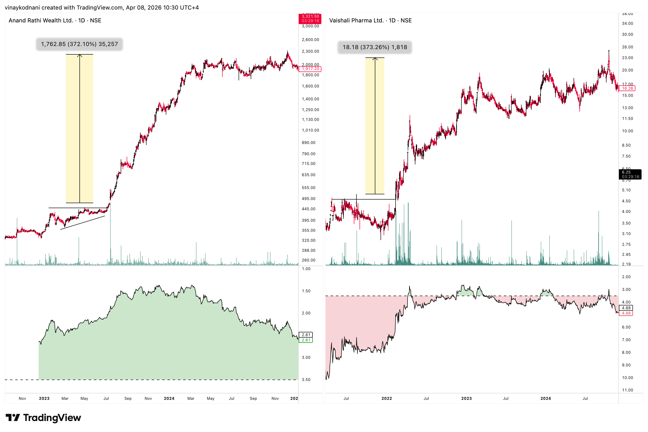 Here are a few examples of how an inverted ATRP filters out the smooth trending phase of market leaders. Study the inverted ATRP pane along with the price action.