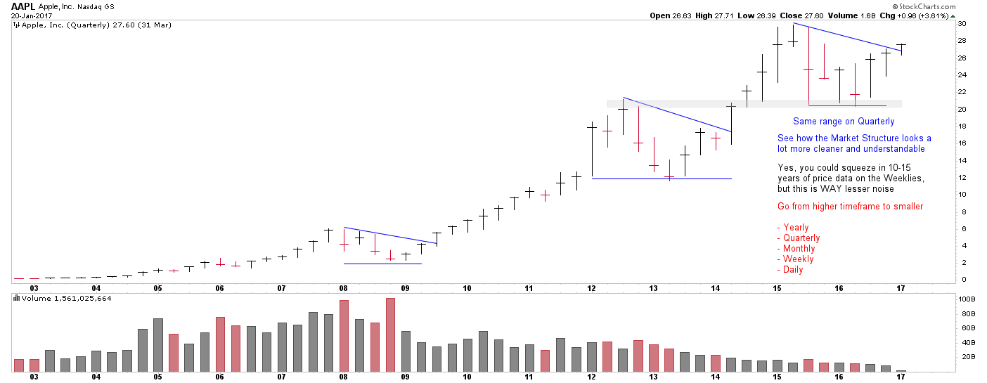 I hope this shows the point I'm trying to make. If you aspire to catch mega-trends, you need to use a tool that helps you hold on. Quarterly charts are perfect for initial analysis. You can then drop down to lower timeframes to get a more detailed picture; or you'll be missing the forest for the trees.